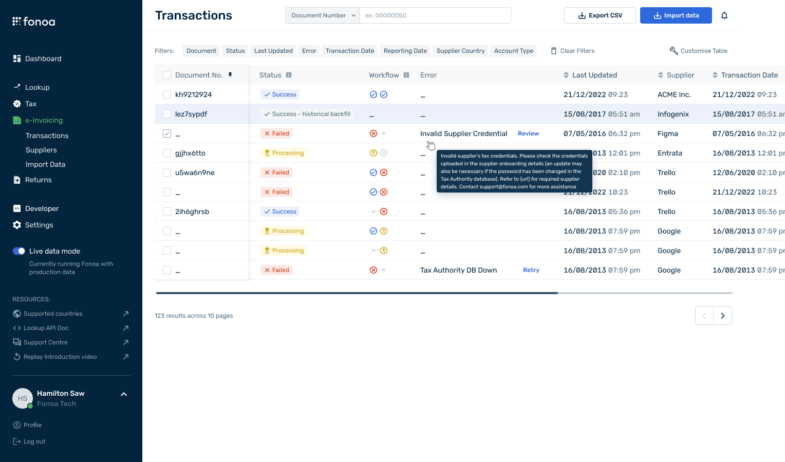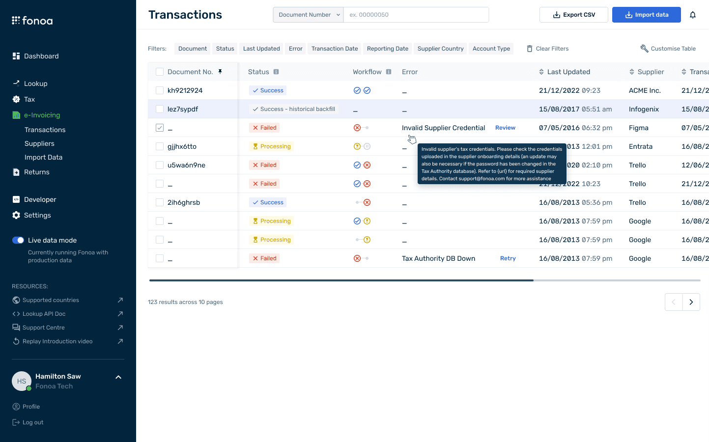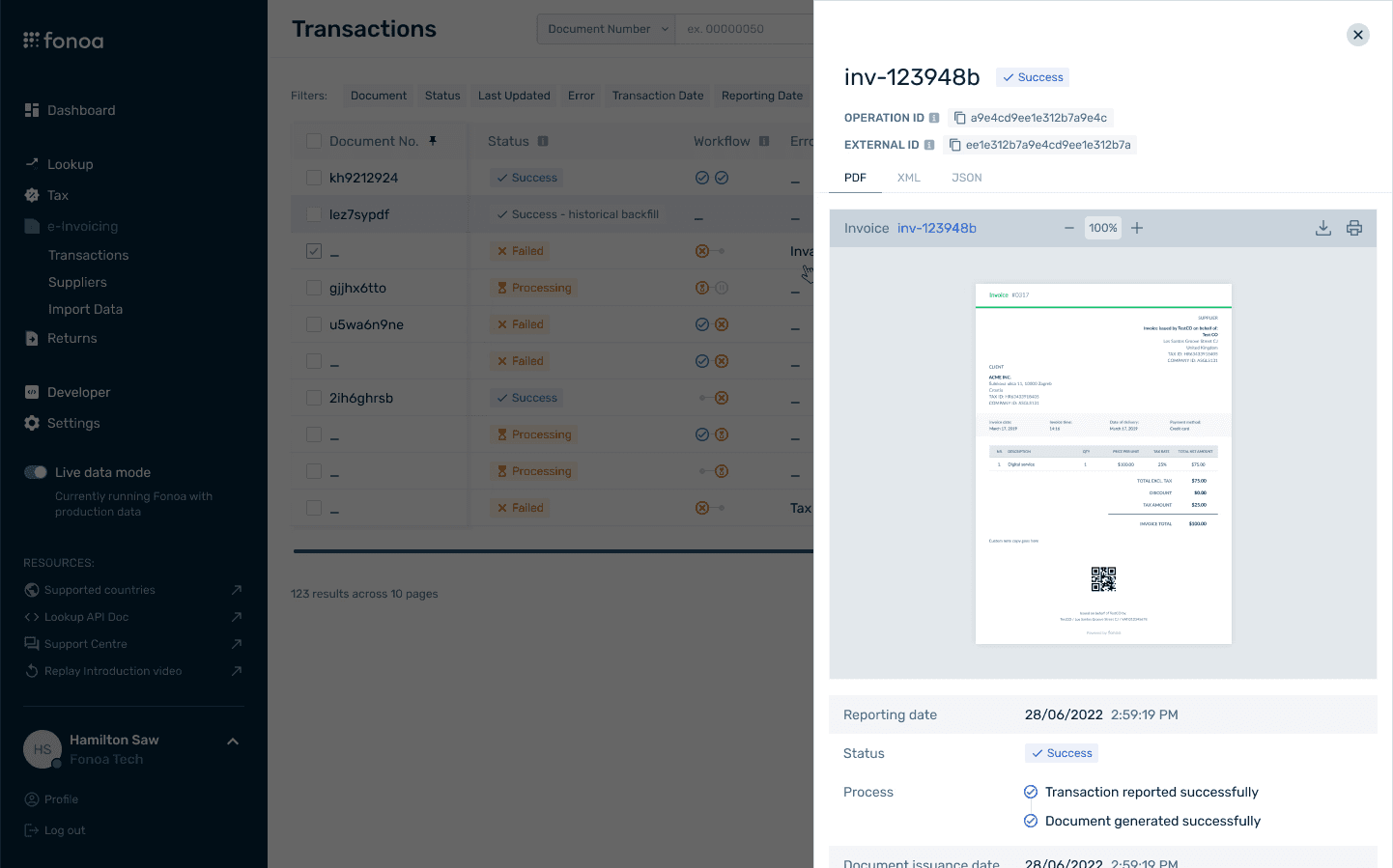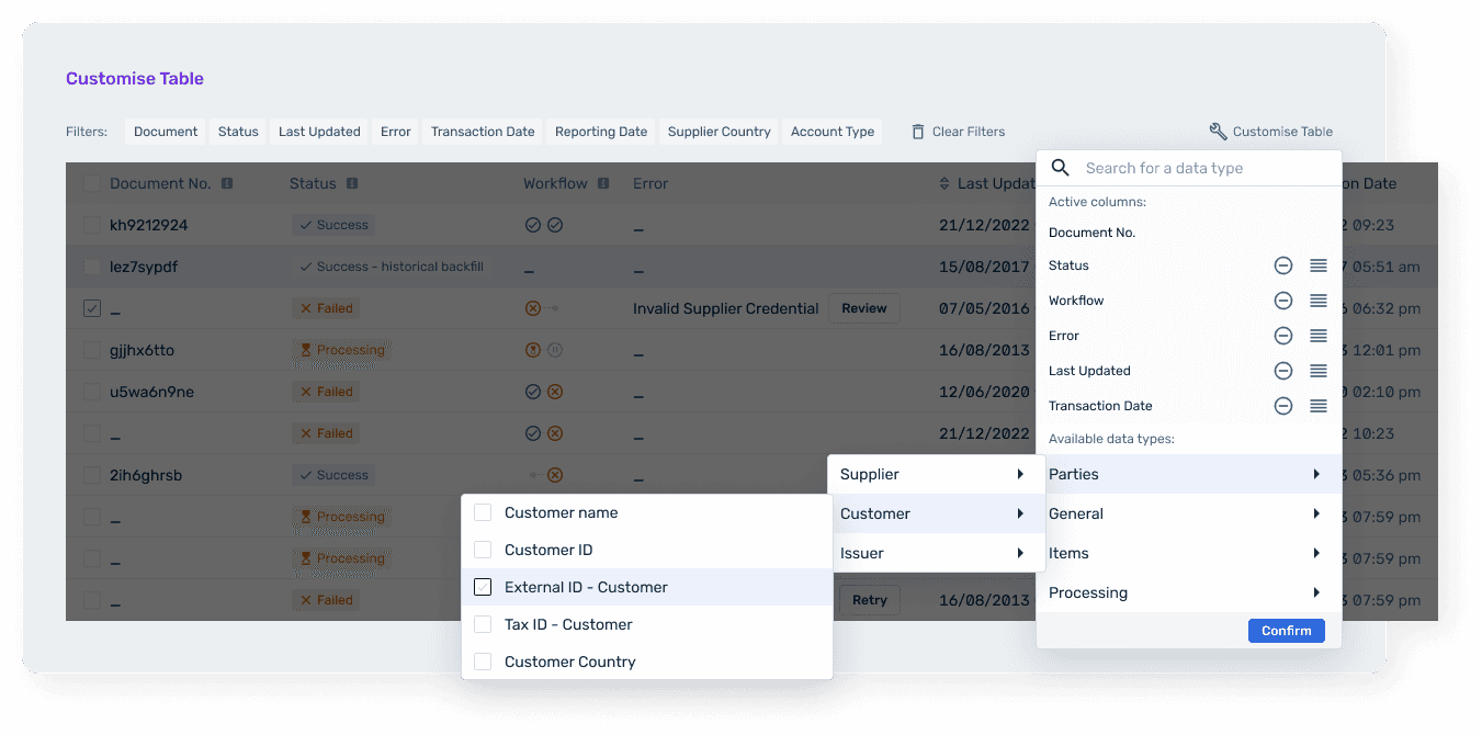 Consolidates data in a single view, establishing e-Invoicing as a Single Source of Truth for transaction data, enhancing client confidence in the platform.